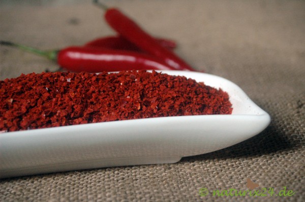 Die geschnittenen Chillies ohne Kerne bieten einen feurigen Höhepunkt in der Küche. Entgegen dem Chilliepulver, ist das Capsaicin, der Stoff, der scharf schmeckt, noch viel besser im Fleisch der Frucht erhalten. Auf naturix24.de erhalten Sie Chillieschoten aus China. Diese werden zunächst geschnitten, von den störenden Kernen befreit, getrocknet und das fertige Chilliegranulat für den Versand vorbereitet. Die Qualität die Sie in unserem Onlineshop erhalten, ist frei von Verunreinigungen, Pestiziden und anderen Zusatzstoffen.Das Chilliegranulat hat eine aromatische Note und kommt von Chillieschoten, die nicht zu scharf sind. Somit bleibt das Essen genießbar. Optimal eignen sich die geschnittenen Chillies für asiatische Gerichte, mediterrane Speisen und vieles mehr. Ob Gemüse, Fleisch, Indisches Kokos-Curry oder Ungarischer Kesseleintopf, die Einsatzmöglichkeiten sind vielseitig, was auch einige süße Rezepte mit Chillie zeigen.